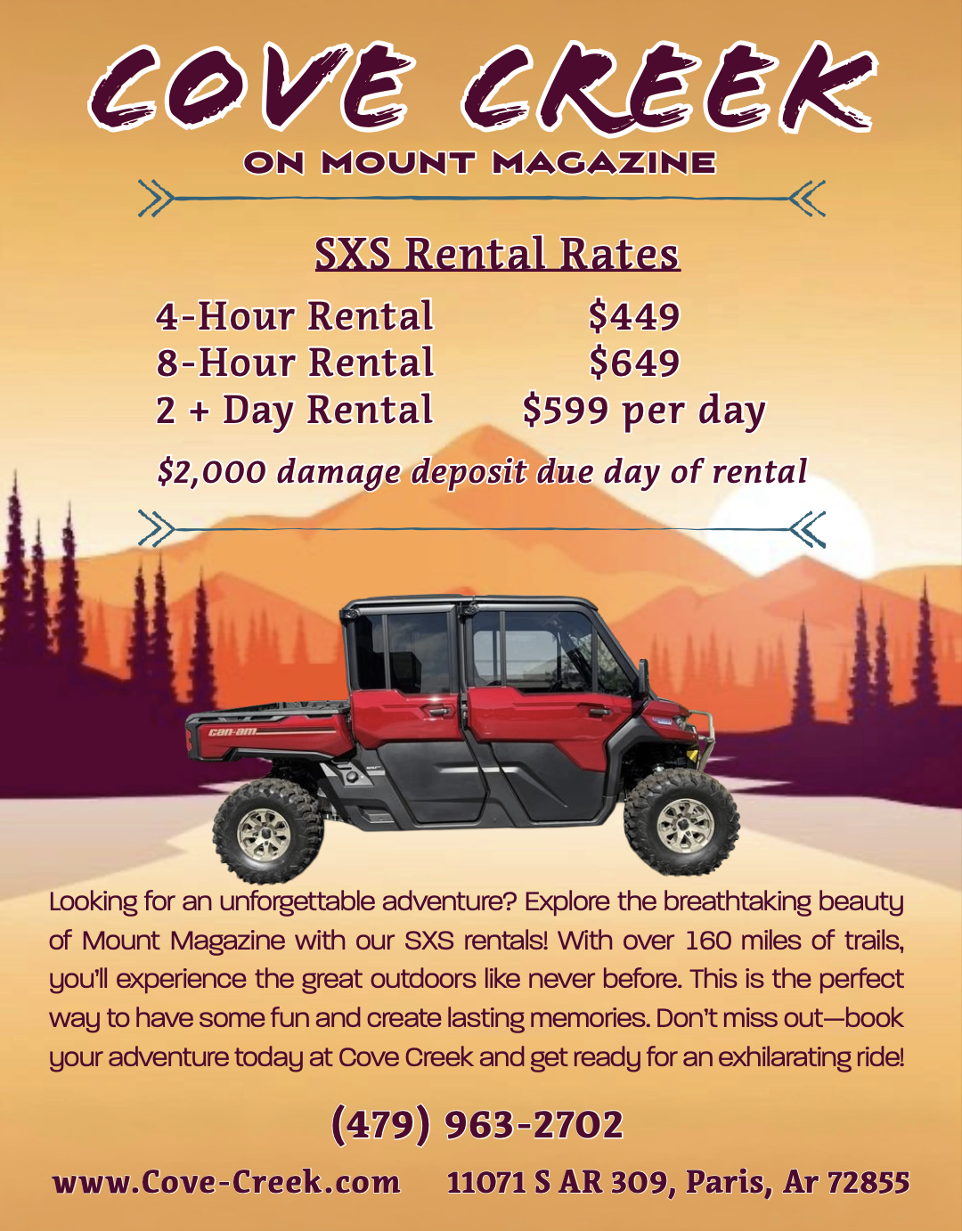Book Now Rental Rates4-Hour Rental . . . . . . . . . . . . . . .$449 8-Hour Rental . . . . . . . . . . . . . . . $649 2 + Day Rental . . . . . . . . . . . .$599 per day$2,000 damage deposit due on the day of rental check-out Book Now